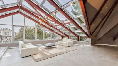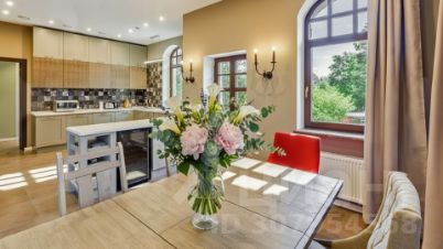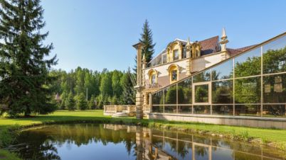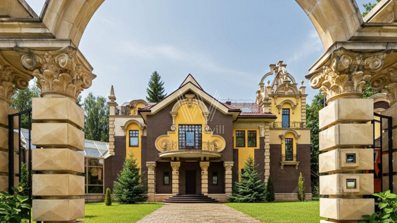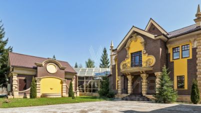 Пруды. Коттедж площадью 700 м² расположен на полевом участке 30 соток. Необычный фасад в стиле модерн обыгрывает классические европейские и современные стили. Дом облицован натуральным камнем, тёмным клинкерным кирпичом и штукатуркой.