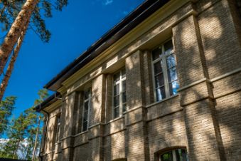 Дом выполнен в классическом европейском стиле с элементами неоклассицизма: фасад из бельгийского кирпича, крыша с французской черепицей и симметричная архитектура. Дизайн гармонично сочетается с природным окружением, создавая ощущение единства с лесным ландшафтом.