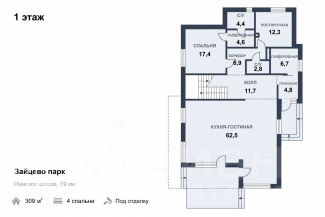 1 этаж: холл, кухня-гостиная, гардеробная, постирочная, с/у, спальня с гардеробной и с/у.