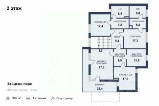 2 этаж: холл, мастер-спальня с гардеробной и с/у, 2 спальни с с/у и гардеробными, балкон.