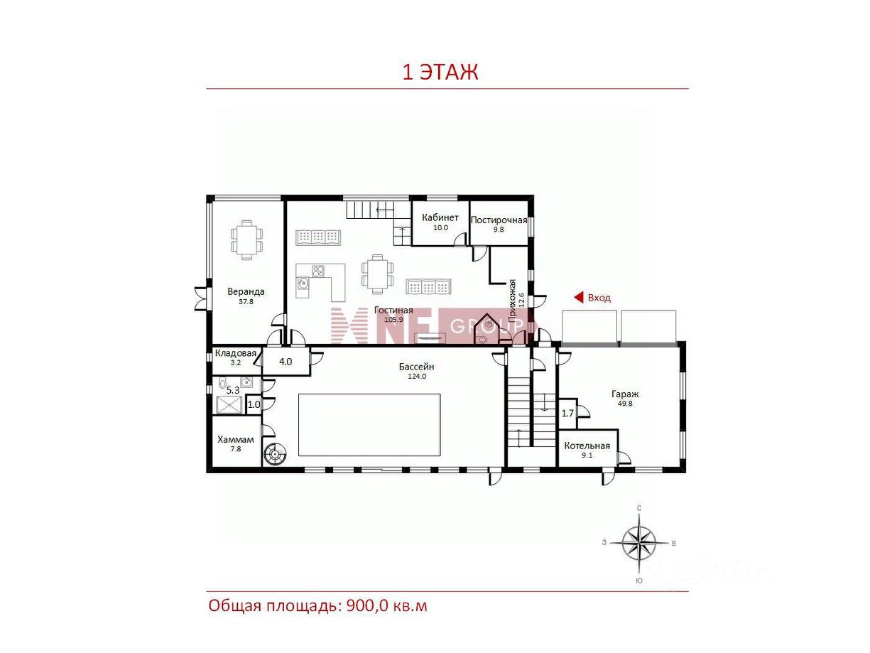 1 этаж: кухня-столовая, гостиная с камином и ТВ-зоной, кабинет, гостевой санузел, бассейн 10,5 на 4,15 метров, хаммам, сауна, постирочная, гараж на 2 автомобиля.