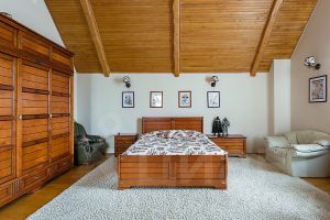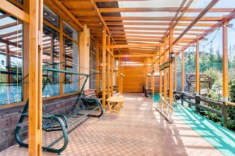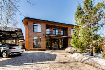 1-й дом основной, площадью 630 м2 (2-х этажный, отделка фасада - лиственница). Состоит из следующих помещений - на первом этаже 2 холла, кухня, гостевая спальня, спальня для персонала, спальня),