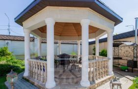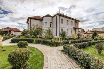 Коттедж 950 кв.м. с фонтаном из розового мрамора, участок 20 соток. Фундамент и перекрытия-монолит. Дом-кирпич. Отделка фасада песчаник. Балясины на фасаде-травертин. Красивые видовые характеристики