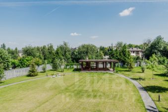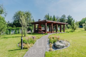 На участке выполнены ландшафтные работы: мощение, подсветка, газон, высажены деревья, кустарники и цветы; построена беседка с мангальной зоной.