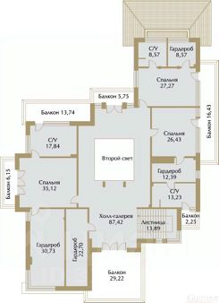 Этаж 2: холл с выходами на балконы, 4 спальни с гардеробными, ванными комнатами и балконами.