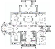 Этаж 1: прихожая, с/у, гардеробная, кухня , столовая, гостиная со вторым светом, комната для завтраков, каминный зал,кабинет, с/у.