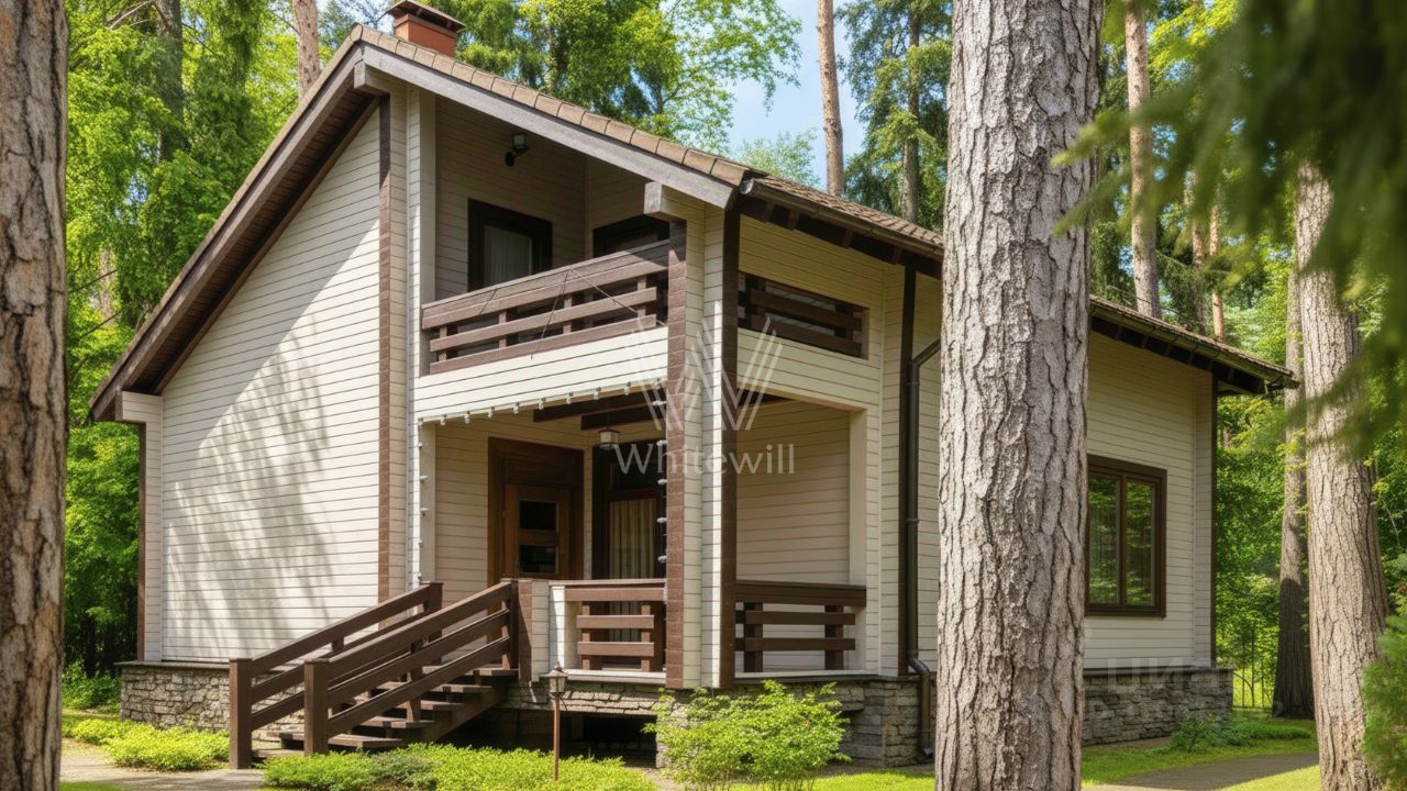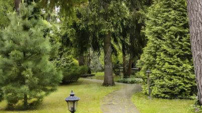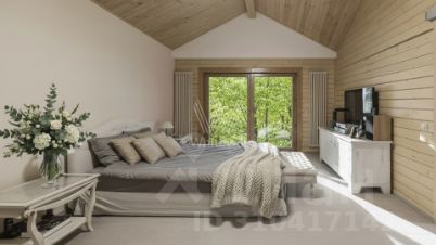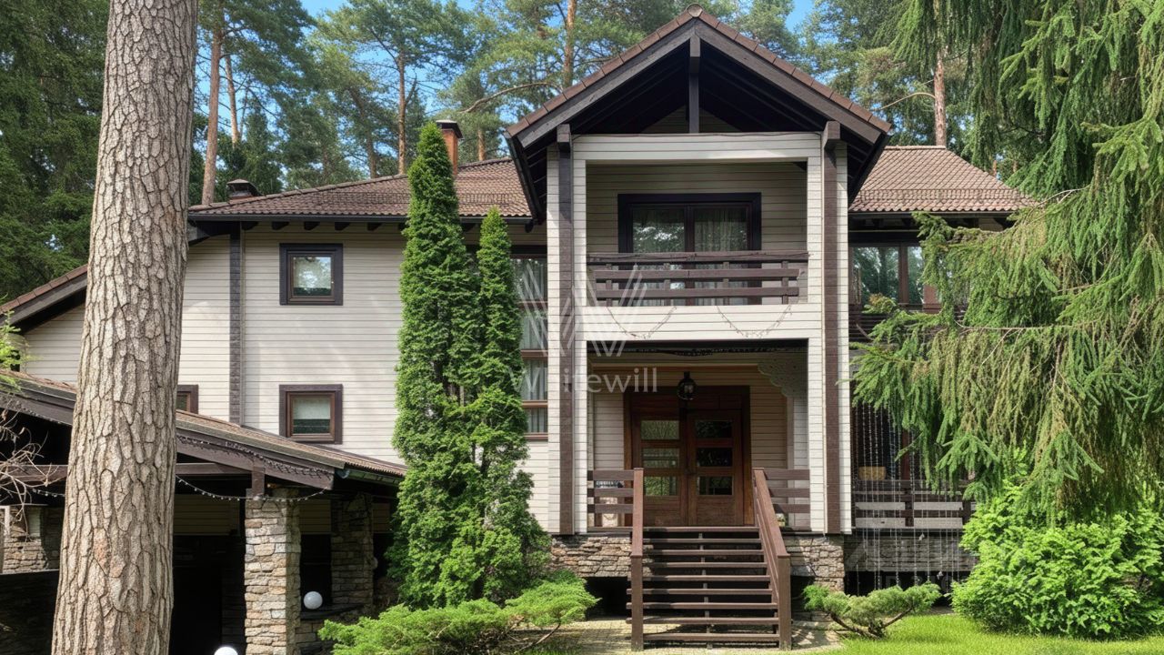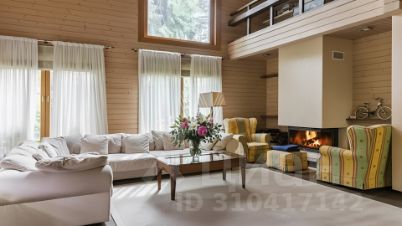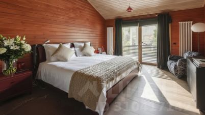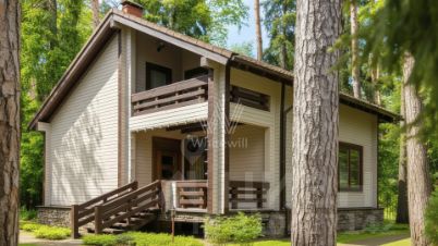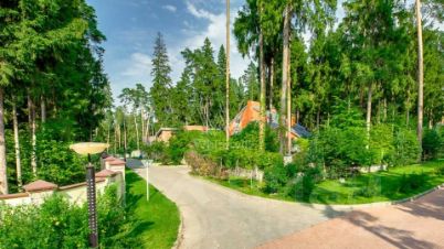 Сосновый Бор. Загородный дом площадью 570 м² построен на участке 30 соток в окружении многолетних деревьев. Фасад здания в стиле "шале" выполнен из бруса, затонированного в серый цвет. В отделке интерьера сохранена фактура дерева, создающая атмосфера уюта. Планировка резиденции включает 3 спальни, гостиную со вторым светом, кухню-столовую, кабинет, сауну, купель, бильярдную и тренажерный зал. Предусмотрен гараж на 2 машины. Рядом расположен гостевой дом площадью 250 м². На участке выполнен ландшафтный дизайн и вымощены дорожки.