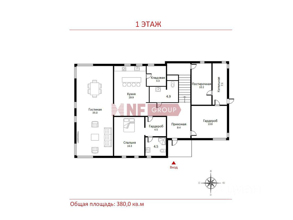 1 этаж: гостиная, кухня-столовая, гардеробная, котельная, спальня с с/у, с/у, ванная;