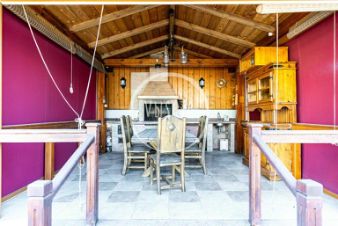 На участке: Гостевой дом 130 кв.м (1 этаж: гостиная-студия с камином, кухней, обеденной зоной. Сауна, с/у, прихожая. 2 этаж - 2 спальни, с/у). Гараж на 2 мм, домик для персонала с погребом, беседка.