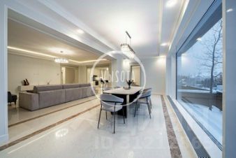 Предлагается к продаже современный дом в КП "Усово-8". Дом с 5-ю спальнями, общей площадью 400 кв.м., представлен "под ключ" и расположен на видовом участке 8 соток. Удобная планировка идеально подходит для большой семьи. Абсолютно новый дом возведен в соответствии с высокими стандартами строительства и полностью готов к проживанию. Монолитный железобетонный фундамент обеспечивает прочность конструкции здания. В отделке использованы премиальные материалы, в том числе мрамор и паркетная доска.