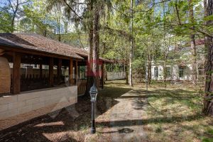 На лесном участке выполнен ландшафтный дизайн, выложены дорожки и установлено уличное освещение. На участке также расположен гараж на одно машиноместо с квартирой для персонала на втором этаже, беседка-барбекю.
