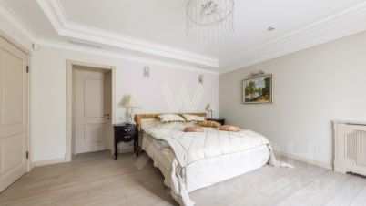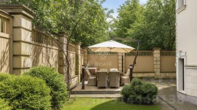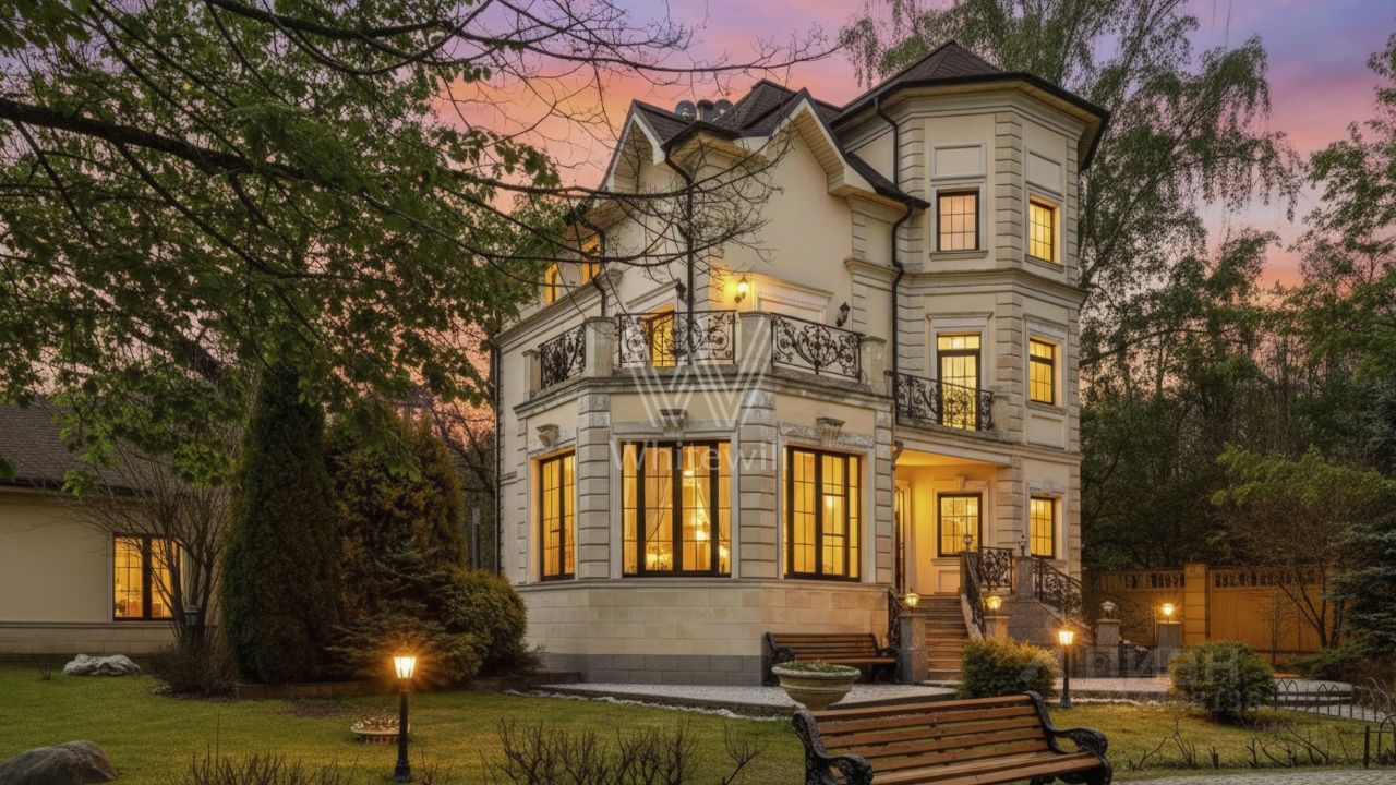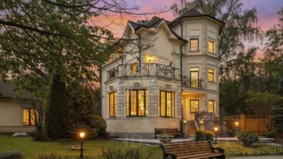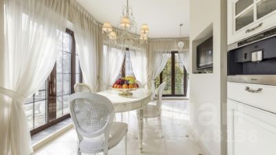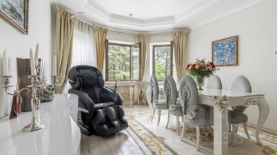 Николина гора. Загородный дом площадью 370 м² расположен на участке 19 соток рядом с живописным лесом. Фасад в замковом стиле, отделанный кремовой штукатуркой и плиткой с фактурой камня по цоколю, дополнен изысканными деталями — рустовкой, молдингами и подсветкой, подчеркивающей архитектуру здания. Современный интерьер с классическими элементами и дизайнерской отделкой выдержан в светлых тонах и укомплектован комфортной мебелью, бытовой техникой Miele и сантехникой.