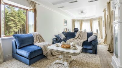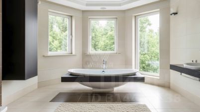 Для дополнительных комфорта и безопасности оборудованы кондиционеры Daikin, приточно-вытяжная вентиляция, теплые полы, встроенная стереосистема и сигнализация с датчиками движения. В четырехуровневом коттедже разместили просторную гостиную с камином, панорамными окнами и выходом на террасу, 6 уютных спален, кабинет, домашний кинотеатр и SPA-зону с сауной и джакузи.