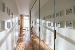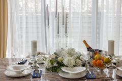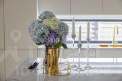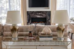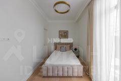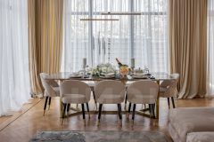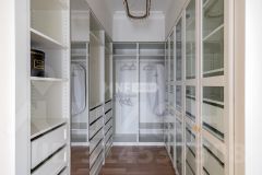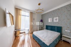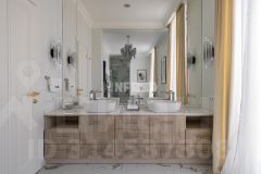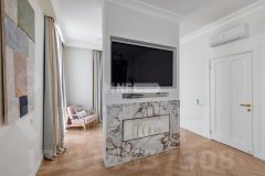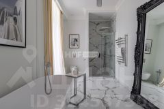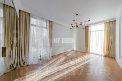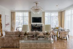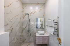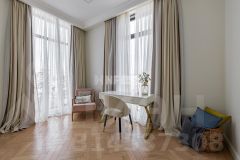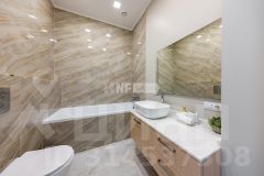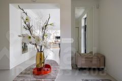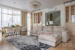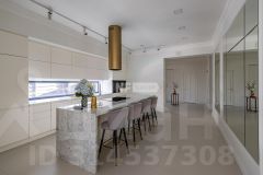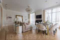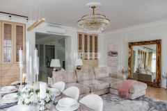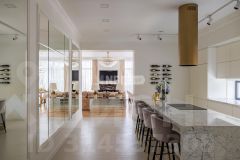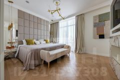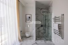 В отделке использованы только премиальные материалы: французская доска и паркет из ясеня, натуральный мрамор в кухне, столовой зоне и санузлах, дизайнерские обои Roberto Cavalli. По всему дому — теплые полы, скрытые конвекторы под окнами и встроенная аудиосистема с Bluetooth, доступная даже в ванных комнатах. Высокие потолки (3,1 м) и панорамные окна наполняют пространство светом.