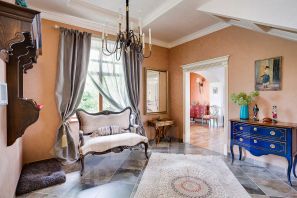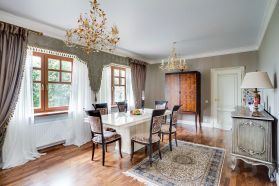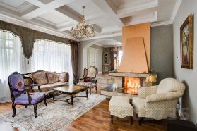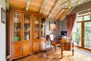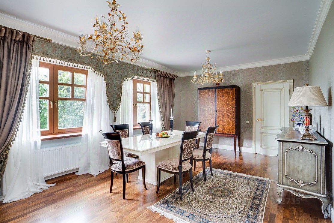 Дом с 4 спальнями, кабинетом, просторной гостиной, столовой и СПА зоной. Фасад дома в немецком стиле с облицовкой голландским клинкерным кирпичом. Кровля выполнена из натуральной керамической черепицы немецкого производства. Деревянные стеклопакеты высокого качества. На территории участка есть квартира для персонала, гараж, летняя кухня.