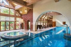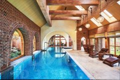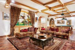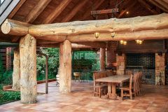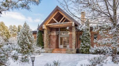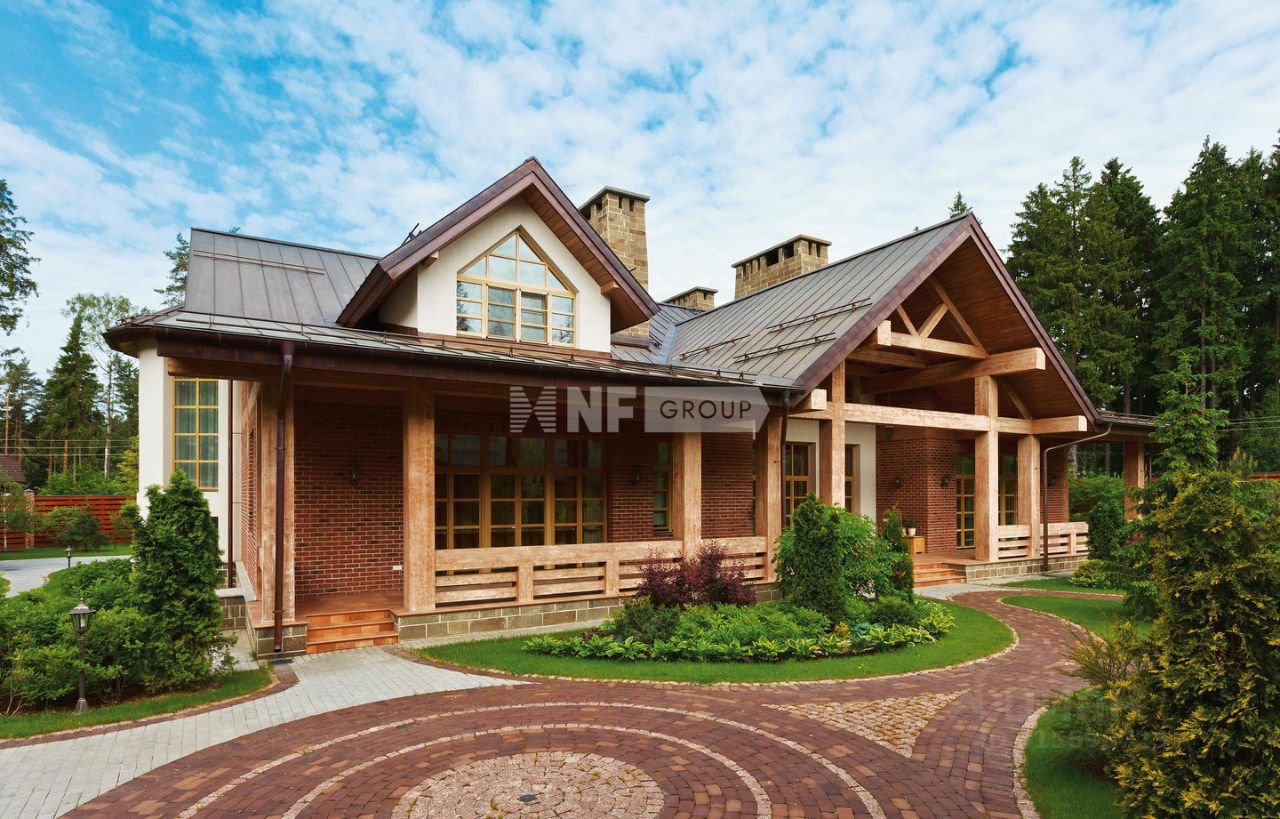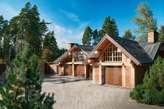 Расположенная на просторном участке 50 соток, загородная резиденция объединяет 4 архитектурных объекта в едином стиле швейцарского шале: трехуровневый жилой дом, двухуровневый SPA-комплекс, дом для персонала и гараж с постом охраны. Широкие силуэты крыш с мощной системой стропил из хвойных пород деревьев органично сливаются с кронами вековых деревьев, создавая гармоничный ансамбль, где кирпичная кладка сочетается с бревнами ручной рубки.