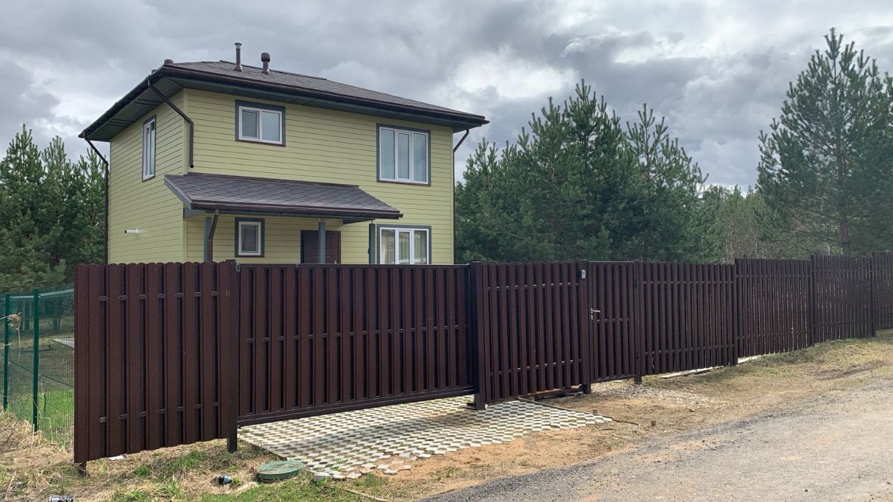 Забор металлический штакетник по фронтальной линии, калитка и откатные ворота. 3Д сетка по соседям с трех сторон.