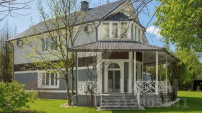 Рождественно.  Коттедж площадью 450 м² расположен на полевом участке 15 соток. Архитектура здания отличается лаконичностью и отражает европейский стиль с элементами фахверка. Фасад выполнен в серо-белых тонах и декорирован деревянными элементами. У входа расположены ступени, ведущие в парадную зону с белыми колоннами и ограждениями с геометрическим рисунком. Завершает композицию многоскатная крыша с карнизами, которая вносит структурную динамику.
