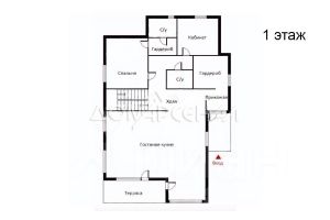 1 этаж: прихожая с гардеробной, холл, кухня-столовая, гостиная с входом на террасу, спальня с гардеробной и ванной комнатой, санузел, постирочная
