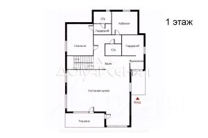 1 этаж: прихожая с гардеробной, холл, кухня-столовая, гостиная с входом на террасу, спальня с гардеробной и ванной комнатой, санузел, постирочная