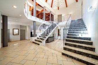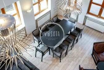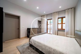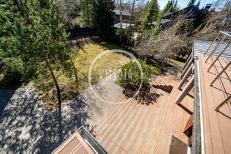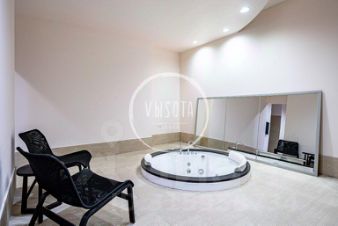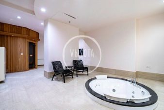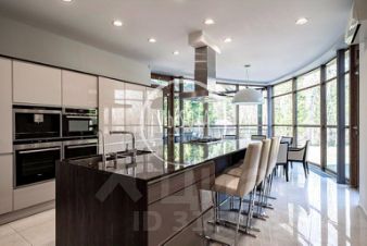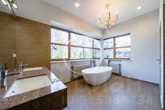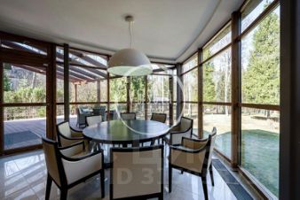 В доме 4 спальни со своими санузлами, зона спа с сауной и джакузи, летние веранды, гараж на 2 машины, квартира для персонала. Дом построен из кирпича с утеплителем. К элементам отделки относятся: массивная доска, итальянская плитка, немецкая кухня, техника Siemens, сан. техника Duravit, Hansgrohe и Jacuzzi, мраморные лестница и подоконники, подогрев полов, приточно-вытяжная вентиляция. В доме установлены современная дизайнерская мебель и освещение. Есть оптико-волоконный скоростной интернет и спутниковое телевидение.