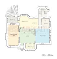1 этаж: холл, гардеробная, кухня-столовая, спальня-кабинет, каминный зал, гостиная, с/у.