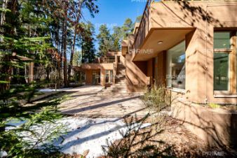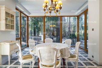 Внушительное трехэтажное домовладение, площадью 1250 кв.м., уютно вписалось в 90 соток лесного участка в коттеджном поселке "Сосны". Расположено на 24 км от МКАД по Рублево-Успенскому шоссе.