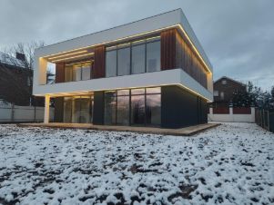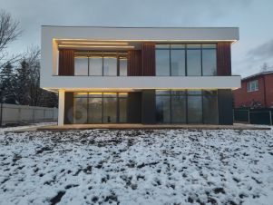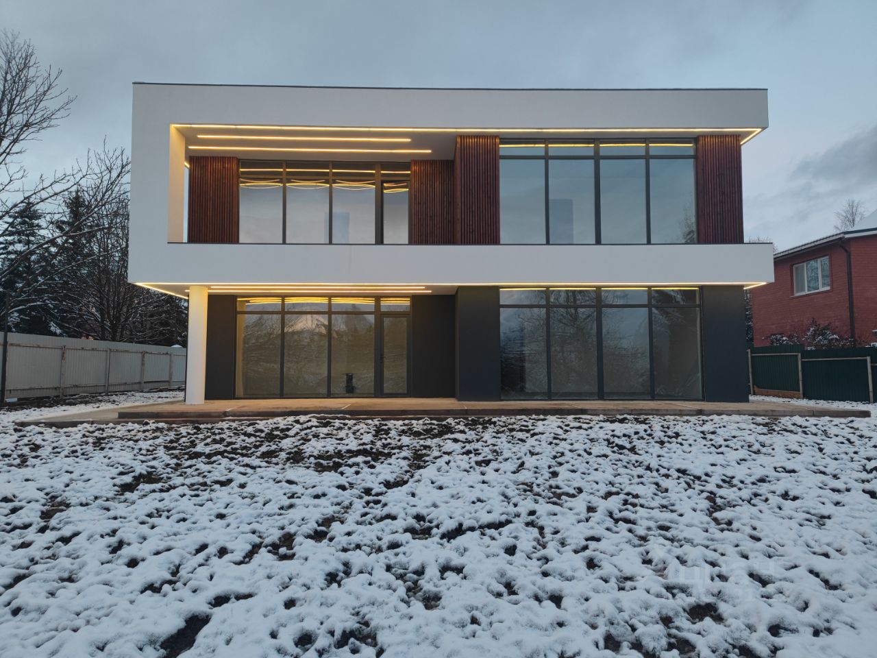 Современный дом 300кв.м. по индивидуальному проекту с плоской крышей на участке 10 соток. Пять спален, четыре с.у., три гардеробные, просторная кухня-гостиная, эргономичная прихожая, отапливаемый гараж на 2 машины.