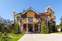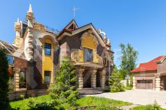Уникальная концепция оформления экстерьера, подчеркнутая выразительными элементами из клинкерного кирпича и мозаики, делает этот трехэтажный коттедж неповторимым произведением архитектуры в живописном поселке Пруды всего лишь в 15 километрах от Москвы по Рублево-Успенскому шоссе.