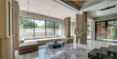 2 этаж: холл, мастер-спальня с санузлом и гардеробной комнатой (из мастер-спальни выход на террасу второго этажа, соединяющую основной дом с гостевым домом с бассейном), спальня с санузлом.