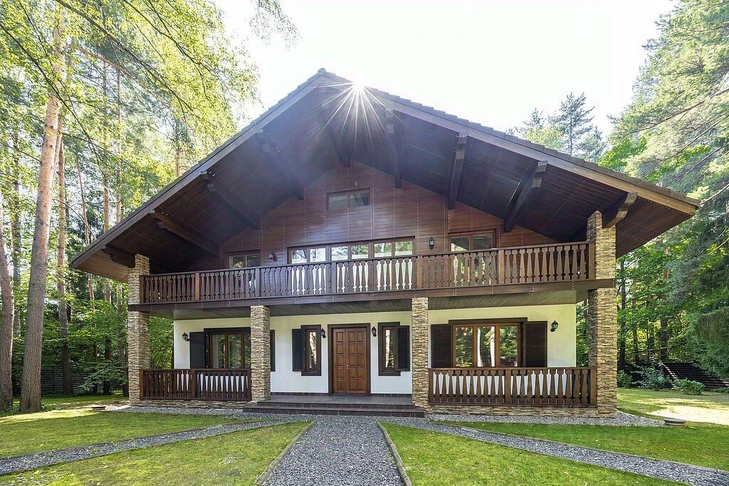 ID 8740. Дом в стиле Шале расположен на лесном участке с вековыми соснами и создает невероятную атмосферу уединения и гармонии с природой.