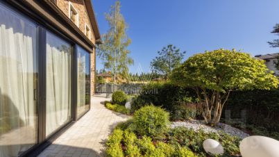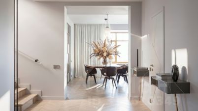 Планировка первого уровня включает просторную гостиную-столовую, кухню с функциональным островом, зимний сад с камином и кабинет. На втором этаже расположены три комфортабельные спальни. На цокольном уровне разместили спа-зону с сауной, массажным кабинетом, душевой и гардеробной, а также блок для персонала с кухней и спальней. Дополнительное преимущество — встроенный гараж на две машины. Участок благоустроен — аккуратный газон и ландшафтный дизайн создают гармоничное пространство для отдыха.