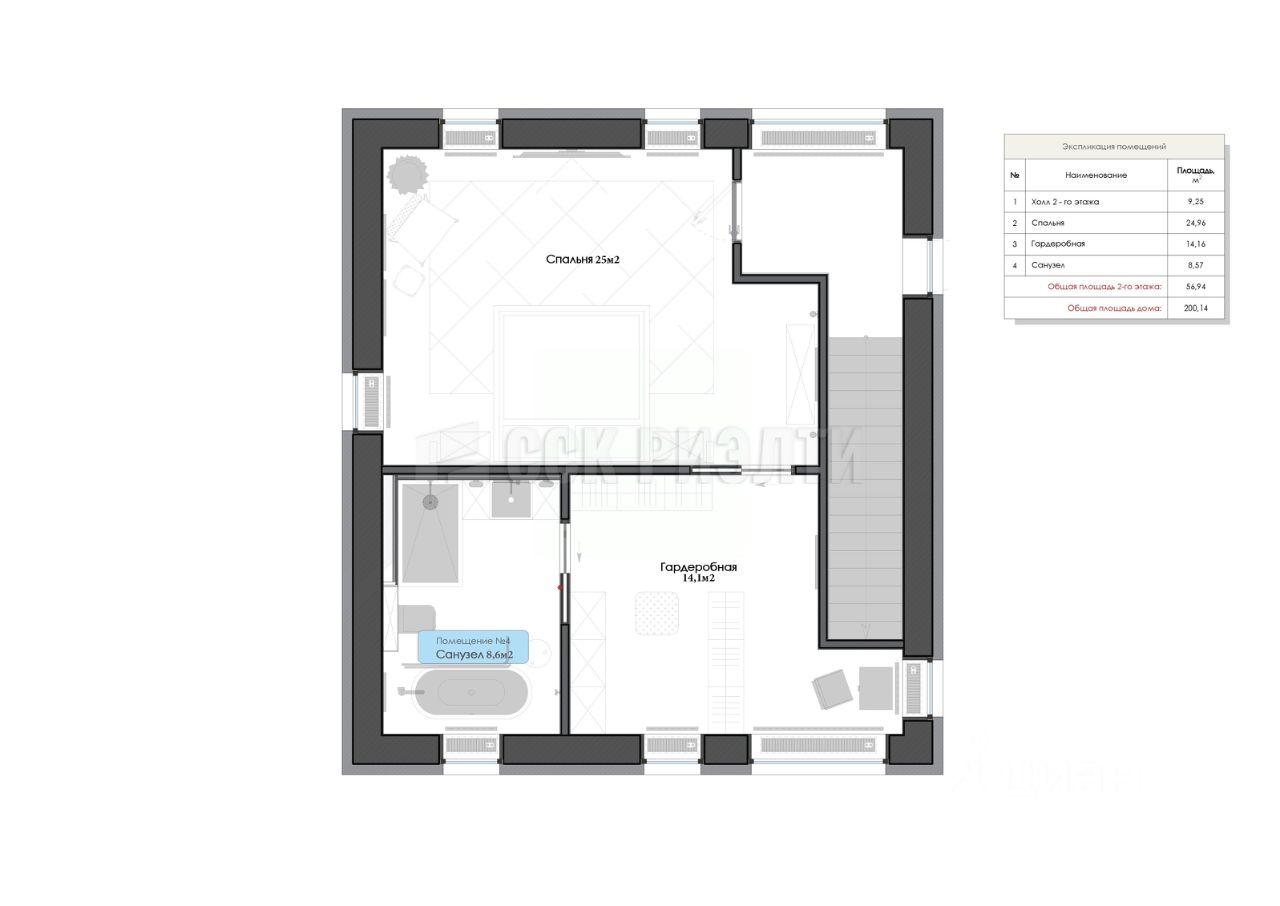 -мастер-спальня со своим санузлом и гардеробной с выходом на эксплуатируемую террасу площадью 58м2.