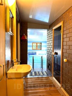 1й этаж: большая гостиная с камином, кухней; основная спальня с гардеробной и санузлом; кабинет, холл, санузел, а также просторная и очень светлая вторая гостиная; бассейн и баня (сауна, турецкая баня).