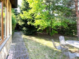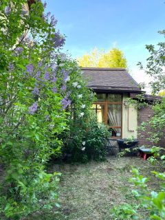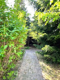 Участок ухоженный, зеленый, есть большая лужайка для посиделок на улице или детских игр.