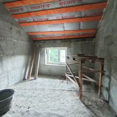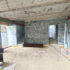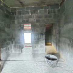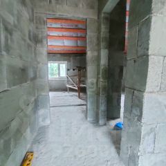 Материал стен - газоблок, пол и перекрытия - бетонные плиты. Фундамент - монолитная плита. Кровля двускатная с водостоком.