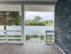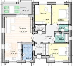 • Планировка дома: тамбур, топочная, коридор, 2-а санузла, кухня-гостиная с выходом на террасу, 3 спальни, гардеробная.