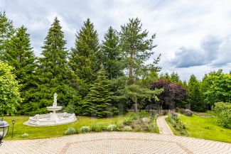 На территории построены 4 гаража, гостевой дом, летний домик, беседка и зона барбекю, а также обустроены парк, сад, фонтан и паркинг. На участке с 2-мя въездами выполнены ландшафтный дизайн и дренажные работы, установлена система автополива, вымощены дорожки и оборудовано уличное освещение.