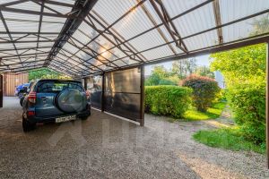 Участок облагорожен, на нем располагается домик для охраны, теплица и навес для двух автомобилей, основной дом расположен в дальнем от дороги конце участка.