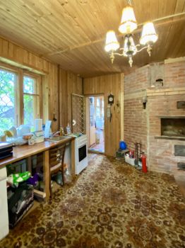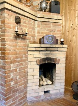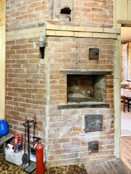 Между кухней и гостиной стоит на отдельном фундаменте большая кирпичная печь с возможностью приготовления пищи на ней, со стороны гостиной это действующий камин.