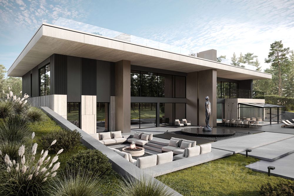 Природный ландшафтный рельеф позволил создать уникальный проект трехуровневого дома. Каждый этаж которого, имеет возможность соединения с живописной природой через большое панорамное остекление.