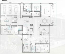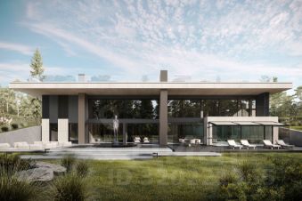1 этаж: холл, просторная гостиная с потрясающим видом на лес, кухня-столовая с выходом на крытую террасу с панорамным видом на воду, кабинет, винная комната, гостевая спальня со своим с/у и гардеробом, рабочая кухня с кладовыми помещениями, с/у, постирочная, гардеробные комнаты, помещение для персонала. Гараж на 4 автомобиля.