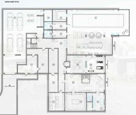 0 этаж с панорамным остеклением: холл, мастер спальня с гардеробной и с/у, кинозал, спортзал, сейфовая комната, бассейн 4*15 с зоной отдыха и зоной SPA, с/у, комнаты хранения, гараж на 6 м/м, топочная, тех. помещения.