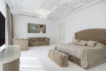 Мастер спальня включает в себя: 2 гардеробные (м/ж), 2 с/у (м/ж), выход на террасу с видом на пруд