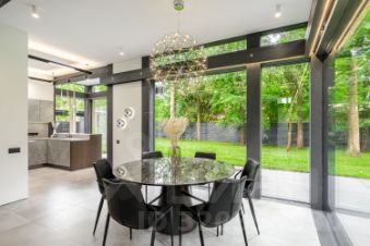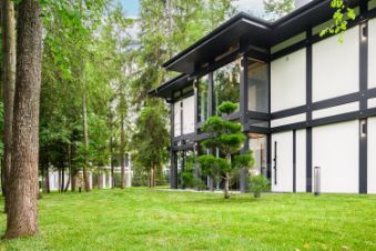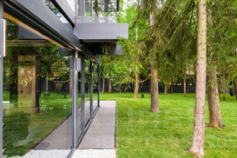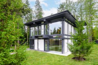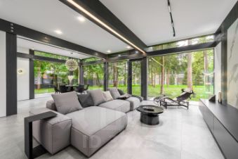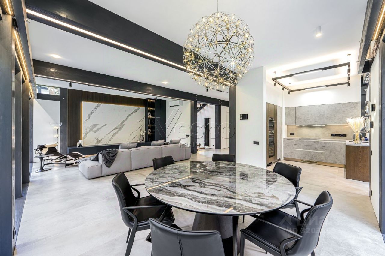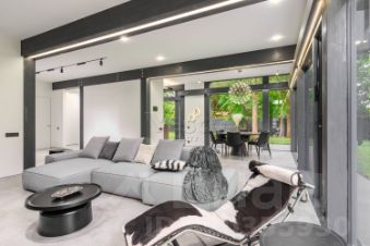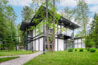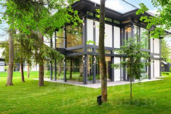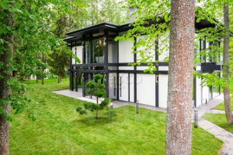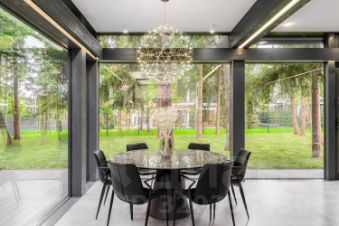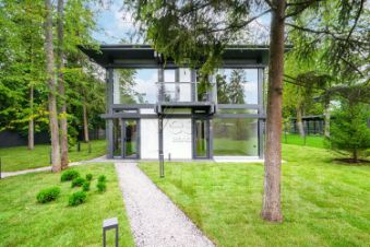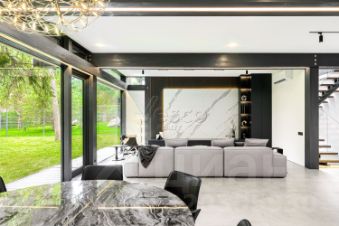 В проекте реализована безбарьерная среда, а благодаря полностью стеклянным стенам, достигается эффект единения с природой. Холодная кровля в стиле Райта добавляет особенную изюминку и избавляет от опасных для детей сосулек. Дизайн в модном сегодня минимализме. Высококачественная отделка, эксклюзивное цветовое решение стен, установлена современная кухня от Giulia Novars, полностью укомплектованная шведской техникой ASKO, встроенной док-станцией с роботом-пылесосом и беспроводной зарядкой для телефона. Столовая-гостиная полностью укомплектована стильной мебелью, есть и культовая кушетка Ле Корбюзье LC4, названная "машиной для расслабления" - икона дизайна ХХ века, занимающая место во множестве музеев дизайна по всему миру.