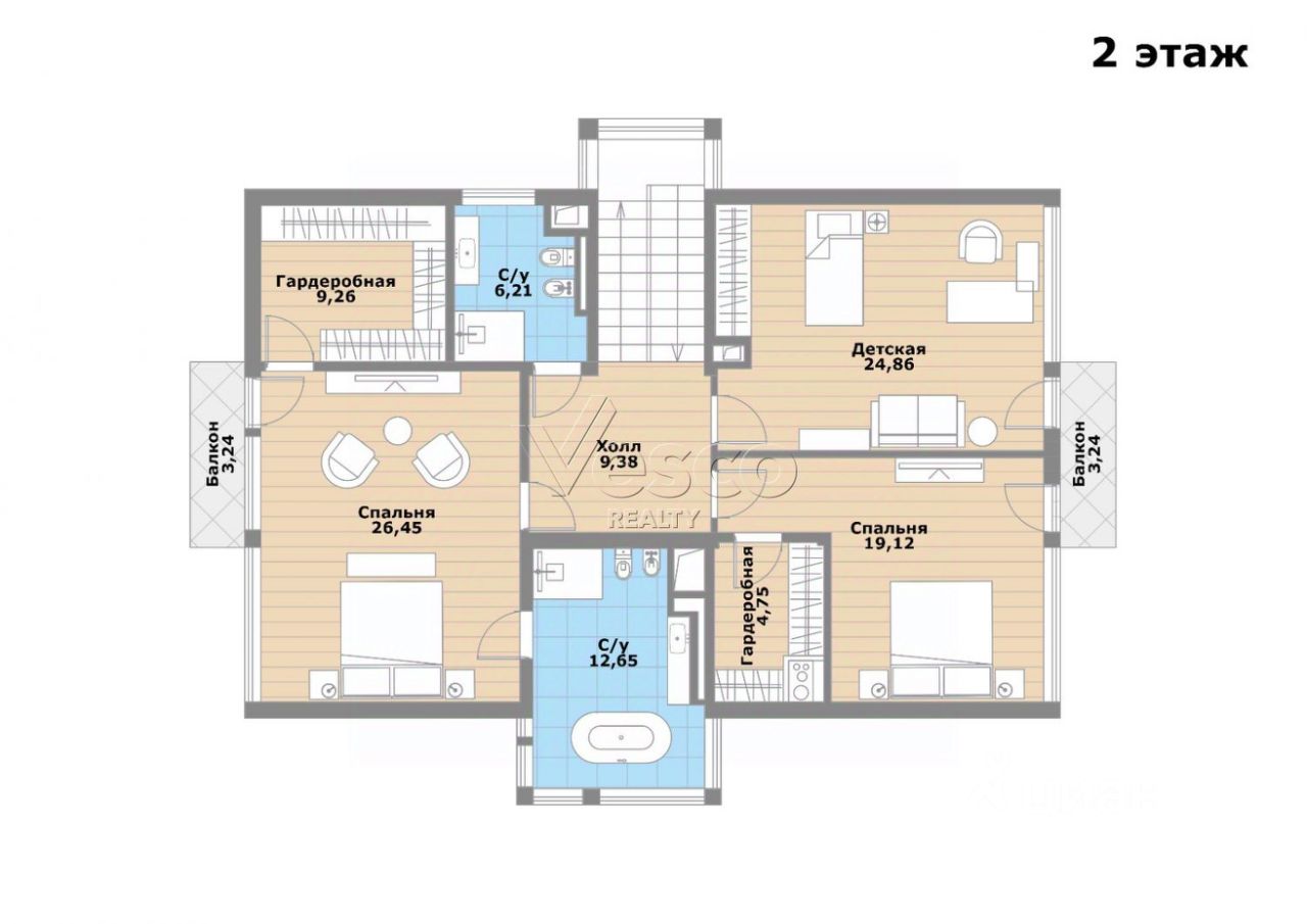 Спальня 20 кв.м с гардеробной и спальня 25 кв.м имеют общий балкон. Санузел с душевой.