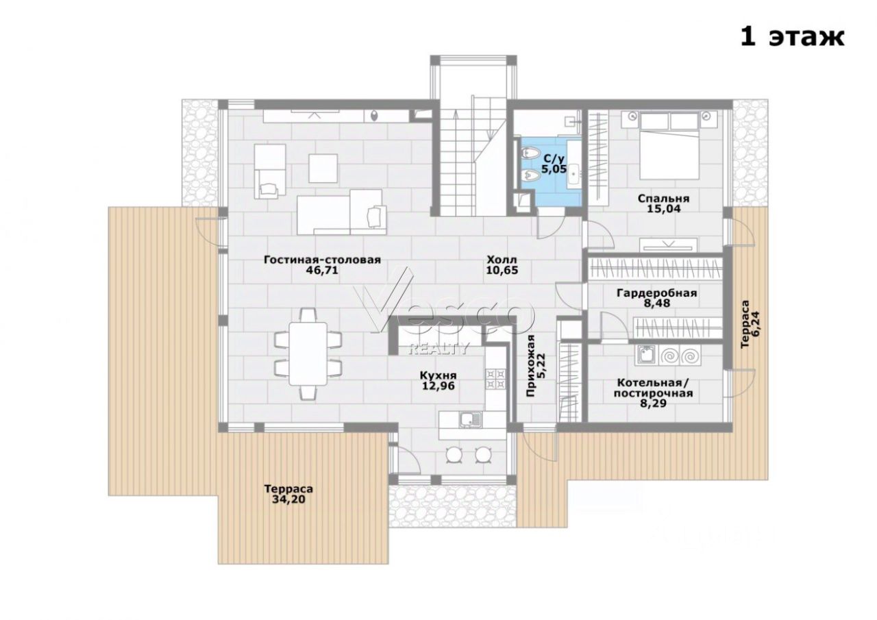 прихожая с встроенным шкафом, просторная гардеробная, кухня-столовая-гостиная 60 кв.м с двумя выходами на просторное патио из качественной ДПК-доски, санузел с душевой и писсуаром, гостевая спальня-кабинет 15 кв.м с собственным выходом на участок, котельная-постирочная.