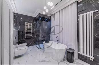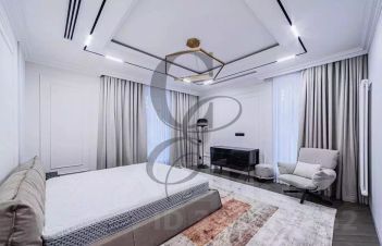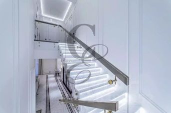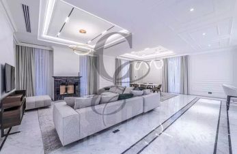 Светлый фасад облицован натуральным камнем, интерьер дома выдержан в едином неоклассическом стиле с использованием премиальных материалов.
