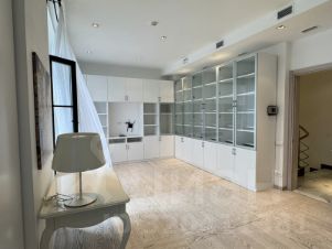 На цокольном этаже находятся функциональные помещения, включая гардеробную, кинотеатр для семейных вечеров, кладовую, котельную и постирочную, а также серверную. 1-й этаж начинается с просторной прихожей, которая ведет в светлую гостиную с большими окнами и уютным камином, создающим атмосферу уюта. Здесь также расположены кухня и столовая, санузел, гараж и холл. На 2-ом этаже находится кабинет, спальня с собственным гардеробом и санузлом.