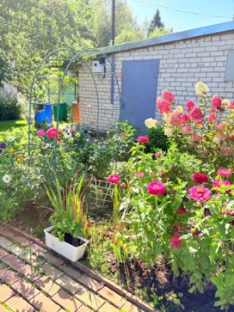 Участок имеет ровную форму.Растут вишни, черешня, груша, кусты смородины желтой ,черной.Растет виноград "Изабелла".Имеется большая 6 метровая теплица.Стоит колодец с крышей домиком.Газон и много цветов.